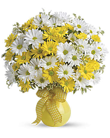 What better gift to send someone than a sunny smile? Think how much that sentiment delivered in the form of this beautiful and cheerful bouquet will mean to whoever’s on your mind today.What could be sweeter than a cheerful yellow vase filled with white and yellow daisies? Can’t think of anything? Then choose this sunny bouquet. It will brighten their day.